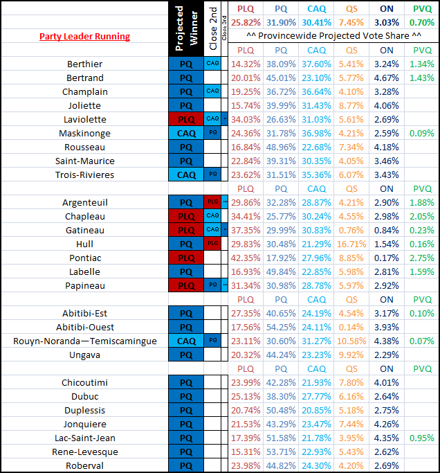 Next, another note is that the CAQ vote is becoming much more efficient. Their regional splits have settled down and they are no longer whompping in the Capitale-Nationale (Quebec City area) but rather only winning by a large margin, they also are down on the Island of Montreal. Without these two areas sucking up votes, there are votes in the Rest of Quebec that are going CAQ. This might be a bit confusing so here is what I mean.